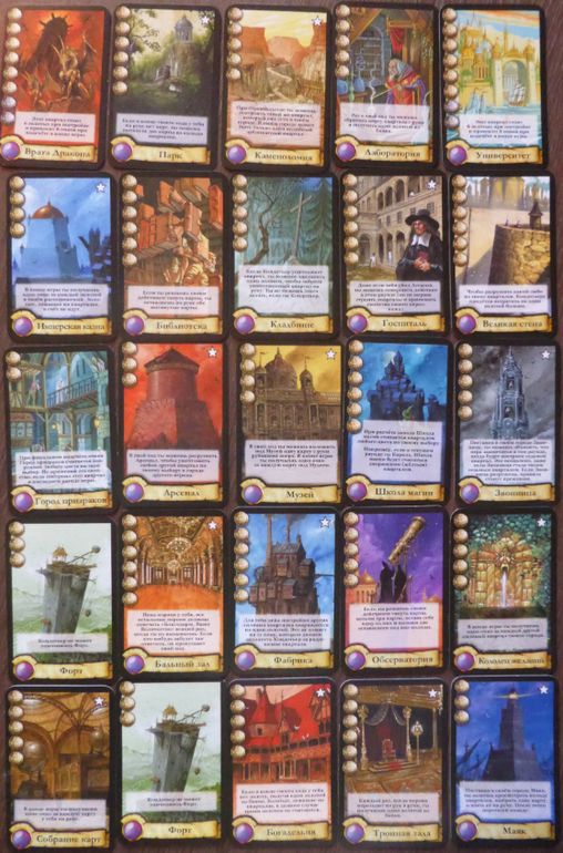 Потом - строить только из дорогих карточек. В принципе, стратегия правильная. (выигрывает тот, у кого больше очков. Но в реальности в игре без дополнений редко выиграет не тот, кто закончил выкладку 8 карт - 4 призовых балла решают все, а если еще и 3 за разноцветность - то ты на коне. В игре с дополнениями собрать все 5 типов карт разных цветов почти невозможно, а фиолетовые стоят довольно дорого, поэтому роль денег тоже повышается).