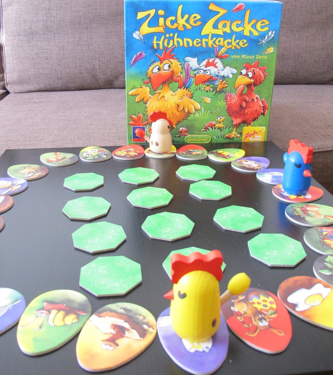 Овальные тайлы-яйца, по которым шагают цыплята - 12 изображений (24 тайла, по 2 шт с каждым изображением) повторяют изображения на шестиугольниках, лежащих рубашками кверху внутри поля. чтобы шагать вперед - надо помнить, где лежит шестиугольник с требуемым изображением. угадал - продвигаешься, не угадал - стоишь на месте. стоять на месте небезопасно - сзади догоняют соперники, которые могут выдрать перо из хвоста. мемори на скорость, азартно, весело.