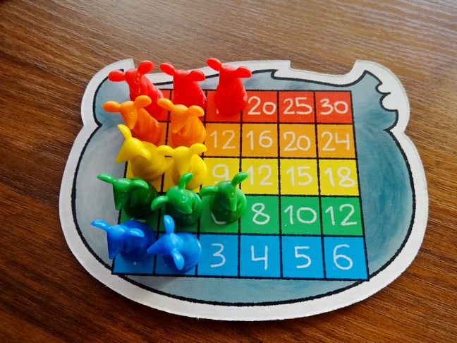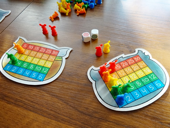 Тренировка сложения получается очень хорошая, но нам пока недоступная. Дочка только учится производить сложение чисел в пределах десяти. Поэтому мы сначала выбрали вариант для малышей, описанный в правилах - считаются не очки за мышат, а просто количество пойманных мышек (то есть получается, что игрок получает по 1 очку за любую мышку). Побеждает тот, у кого мышей больше.