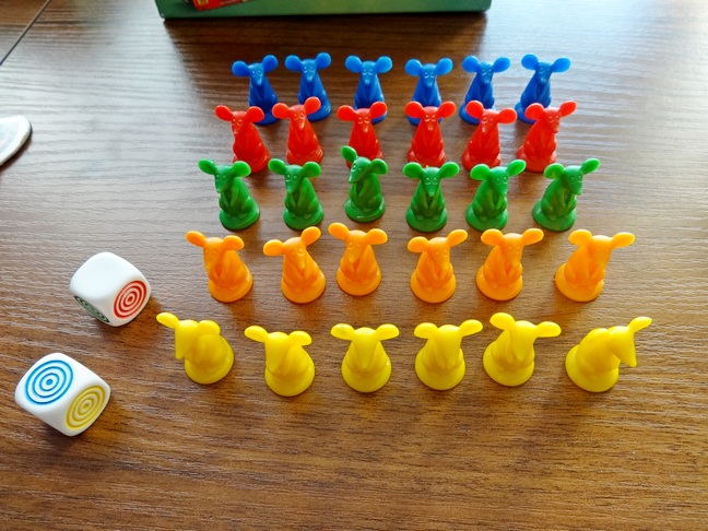 Суть игры в том, что нужно приманить к себе как можно больше мышат. Причем мышки имеют разную стоимость - самые дорогие красные (5 очков за мышонка), самые дешевые синие (1 очко). Приманиваем так: бросаем два кубика и берем мышек выпавших цветов. Кубики можно бросать сколько угодно раз, но! если при повторных бросках у игрока на кубиках выпали цвета, совпадающие с цветом приманенных в этом же ходу мышек, то грызуны разбегаются, и коту игроку не достается ничего (подробнее читайте в правилах). Так что тут важно не жадничать, вовремя остановиться и передать ход другому игроку, иначе можно всех мышей растерять. Все пойманные мышки выставляются на перевернутую кошачью мордочку на свой цвет слева направо. А в конце игры игроки подсчитывают полученные очки, складывая числа под пойманными мышатами каждого цвета.