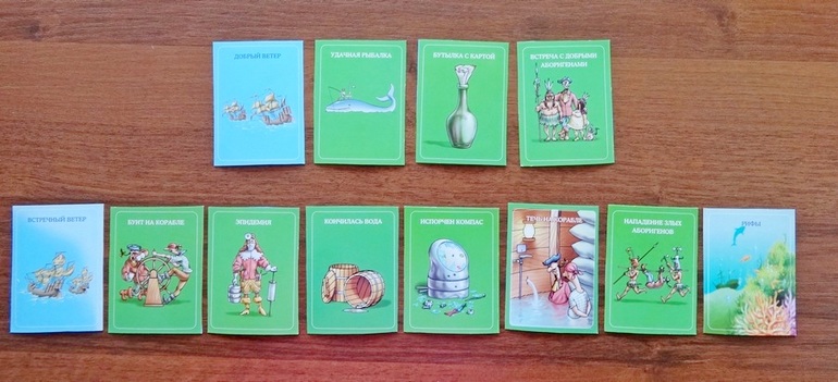 Надписи на моем фото видны плохо, но сверху лежат те, что помогают игроку, а снизу - мешают. Соотношение видно. Есть особо неприятные карточки, получив которые игрок теряет карту открытия или вообще возвращается в начало игры (3 на фото ниже).