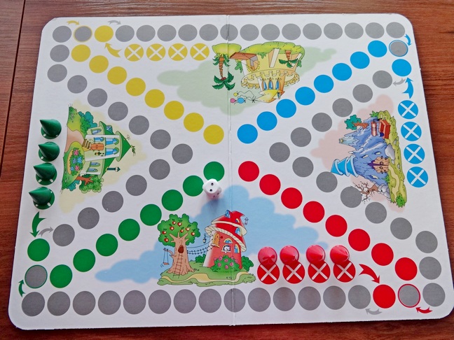 Маршрут получается довольно длинным (колпачки должны пройти полный круг и вернуться на свой цвет) и пройти его должны 4 фишки у каждого игрока. При этом чем больше игроков, тем дольше будет игра длиться. Похоже, и тут нам не обойтись без домашних правил - колпачков можно оставить 3 или даже 2 и добавить второй кубик. Благодаря дополнительному кубику колпачки будут продвигаться быстрее (если складывать значения кубиков), заодно опять же счет потренировать можно будет