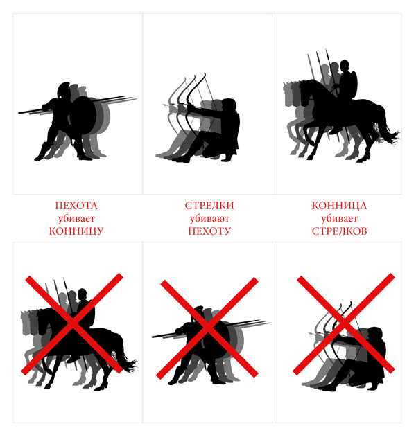 Чтобы сделать этот процесс интересным и приближенным к реальности, мы с сыном придумали забавный карточный "движок". Каждая битва похожа на покер: полководцы подбирают комбинацию из трех родов войск таким образом, чтобы каждая карта побила выставленную против нее карту противника. Грубо говоря, это "камень-ножницы-бумага", умноженные на три. Нам это нравится, потому что исход битвы зависит не от дурацкой удачи, а исключительно от интуиции полководца. PvP вcегда интереснее PvE!