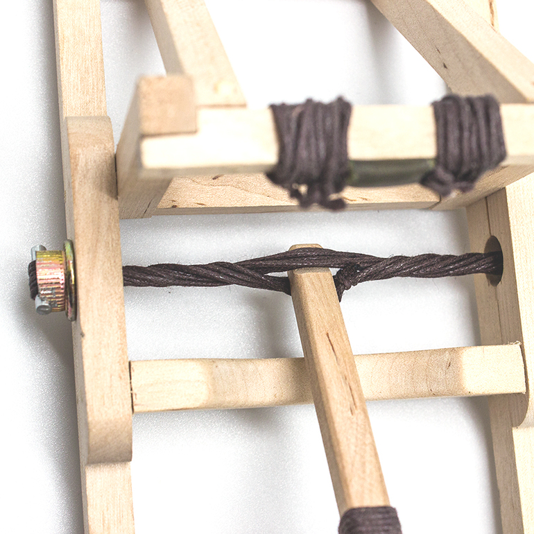 Онагр - это камнеметная машина торсионного типа, то есть энергию для броска ей сообщают скрученные веревки. Механизм довольно прост, такую катапульту можно сделать практически из резинки и трех палок. Но мне хотелось максимального сходства - чтобы и выглядел как настоящий, и работал.