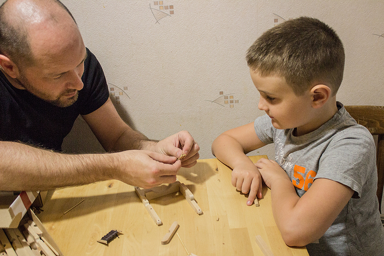Я сначала сделал кривенький первый вариант, чтобы выявить проблемные места, а потом доработал его до уровня сборной модели - с готовыми деталями, которые наследник собирал под моим руководством. Примерно так мы его собирали.