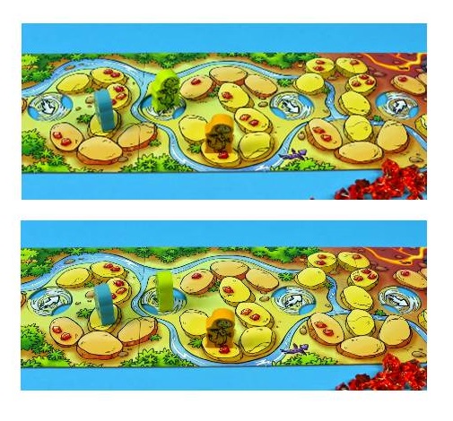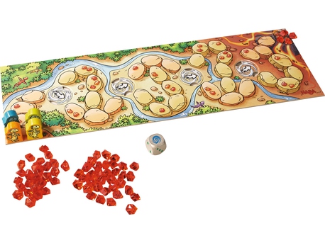 Кристаллы расположены вдоль всего пути к вершине вулкана (они нарисованы на отдельных камнях). В свой ход игрок кидает кубик и продвигается на указанное количество шагов (от 1 до 3). Если он попадает на камень с нарисованными кристаллами, забирает указанное количество в свой запас. На одной из граней кубика нарисован вихрь. Когда кубик выпадает этой стороной, дороги вдоль вулкана меняют свое направление, заставляя дракончиков пойти по более короткой или длинной.
