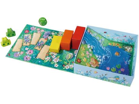 В самом простом варианте игры на кубике всего две цифры - 1 и 2 - справятся даже самые маленькие (фото выше - это вариант игры посложнее). И шикарное оформление! Лягушка, первая достигшая цели, съезжает в пруд с горки.