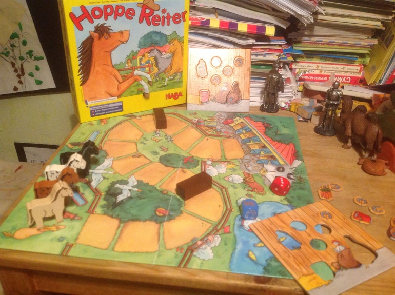 Игра довольно простая, мы ее с первого паза освоили. Лошадок нужно с прогулки отвезти в стойло, при этом они могут зайти в стойло, только собрав корм и подковы. Игрок решает какой кубик бросать. Их в наборе два. Один с цифрами, чтобы двигаться вперед. Второй с изображениями того, что нужно собрать. При этом есть усложнение игры ( мы сразу усложнили) в виде преград, через которые можно только перепрыгивать, когда на кубике с ходами выпадает больше клеток, чем клеток до препятствия. Качество игры обалденное, из рук выпускать не хочется. Чтобы партия длилась дольше, у каждого игрока по две лошадки. Жалею, что раньше не доставала