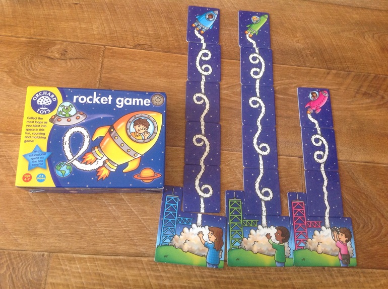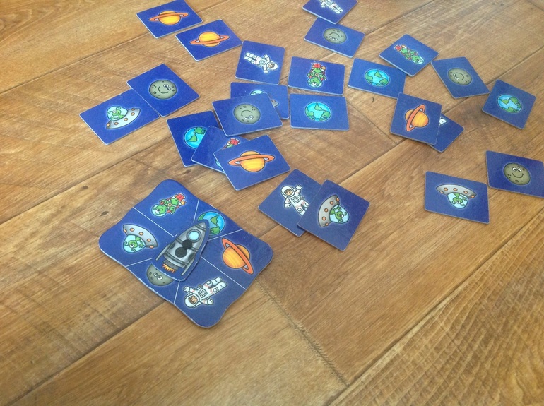 Очень красивая и необычная игра. И к тому же очень прочная. Каждый берет себе стартовую площадку космодрома, раскручивает стрелку и берет карточку согласно выпавшему на стрелке рисунку. При этом важно именно количество петелек, тк по ним потом определяется победитель. Если вдруг выпадает ракета, то таким образом полет заканчивается и новые карточки к траектории уже нельзя ставить. Для увеличения партии каждый берет по два космодрома