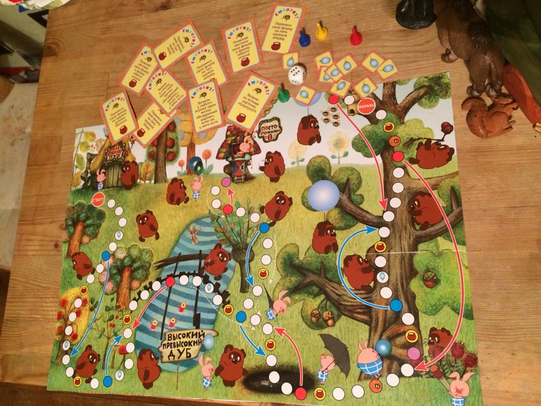 Наш безусловный хит. Двигаемся от старта к финишу, переходя по стрелкам вперед или назад. Особый интерес придают карточки горшочек, особенно задание " поменяй местами свою фишку и фишку другого игрока" и " перенеси фишку на домик Пяточка". Еще есть карточки Воздушный шарик, если у тебя она есть, то ты не передвигаешься назад по стрелке
