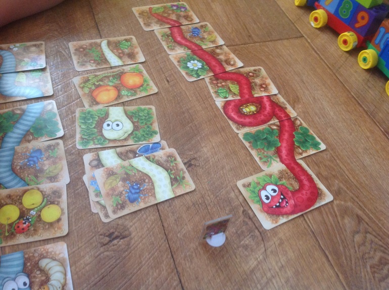 Цель игры быстрее всех собрать червячка ( у нас у каждого по два червячка, чтобы дольше играть), присоединяя к голове червячка разные его части. Присоединить каждую часть можно только накормив червячка - выбросив на кубиках ( их аж 6 штук с разноцветными гранями) то количество раз подходящие по цвету грани, сколько ягодок изображено на данной части червячка. Каждый раз выбросив соответствующий цвет, кормим червячка, ставив кубик на кружок с ягодой данного цвета. Закрыв все кружки, считается, что червячок поел и он удлиняется на одну часть. Побеждает тот, кто первым накормит своего червячка всеми ягодами по очереди, таким образом собрав его длинным-длинным. Тогда голова червячка переворачивается другой стороной, где он изображен в короне и улыбающимся.