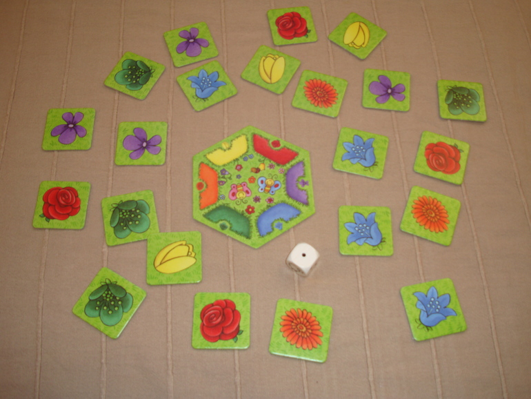 Подготовка. Ставим Беллу на лужайку, вокруг лужайки (в закрытом виде) размещаем цветочные тайлы по количеству игроков: на двоих - по два тайла каждого вида, на троих - по три.