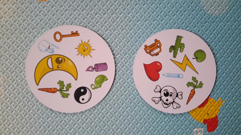 Игра не только интересная и азартная, но и очень-очень полезная. Она прекрасно тренирует и развивает мышление, логику, реакцию. Ведь быстро найти один общий предмет на постоянно меняющихся карточках для 4-5-летнего ребенка очень не легко. Но я уже вижу результат. То, как мы начинали, и то, как ребенок ищет совпадения сейчас, - небо и земля.