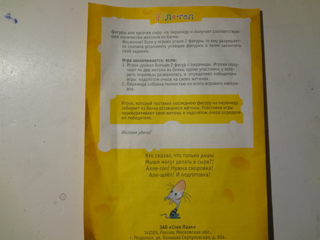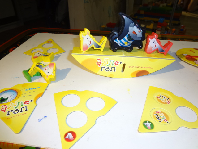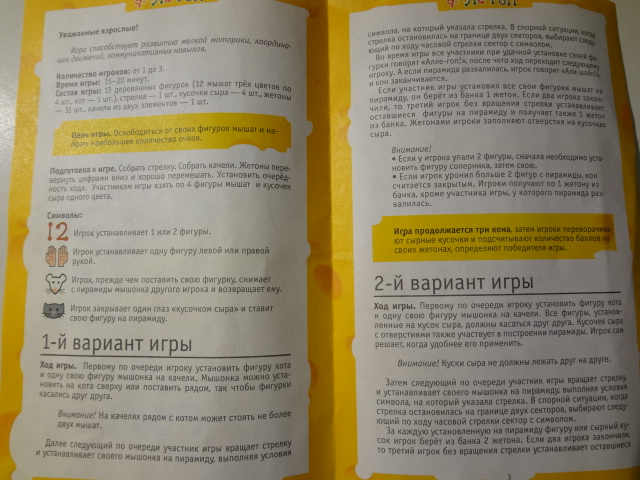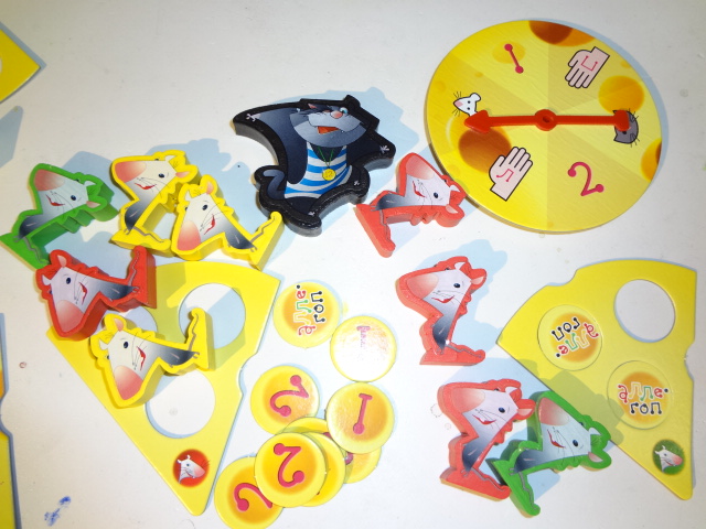 В нее могут играть до трех игроков. В состав игры входят фигурки мышей трех цветов и фигура кота (они сделаны из дерева, очень качественно), стрелка, кусочки сыра, жетоны и качели.