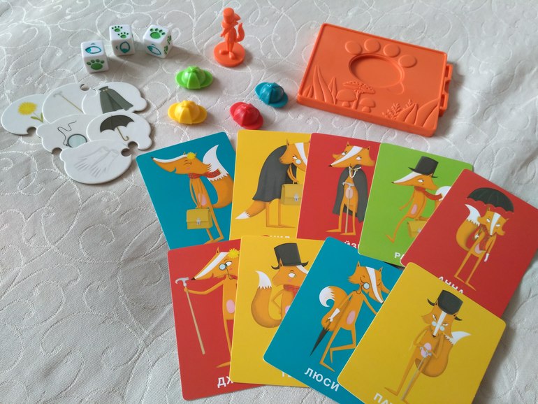Улики, фишки в виде кепок, фигурка Лиса, карты подозреваемых, 3 кубика, Дешифровщик, красивое игровое поле - все это делает игру очень приятной и эстетичной!!