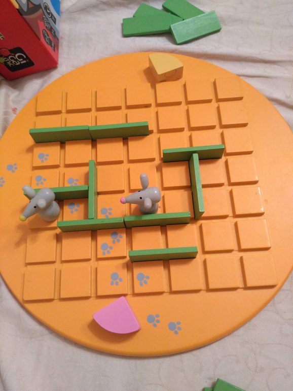 Коридор детский -играем с 4.5лет регулярно, не надоедает. Игра нравится тем что здесь думать надо, каждый свой ход - или самому походить или лучше сопернику преграду поставить. Но партии короткие 5-7 минут, поэтому хорошо вечером перед сном поиграть, интересно и недолго. Ну и оформление очень милое, детское!! Этих мышек дочь любит!!