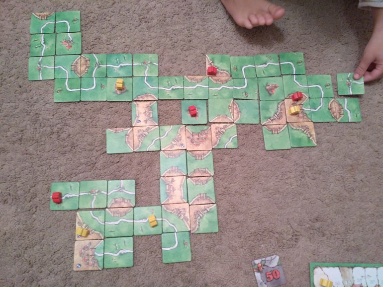 Каркассон - эта наша первая серьёзная игра, Ане пришлась по душе. Ей нравится строить города, дороги, монастыри.. Нравится темп игры - размеренный, вдумчивый со множеством вариантов хода. Мне нравится что можно обсуждать варианты хода, первое время я вслух озвучивала свои мысли по поводу того или иного хода и Аня быстро научилась играть с нами на равных, иногда и нам с мужем делает замечание, что не туда тайл ставим или может ход подсказать.