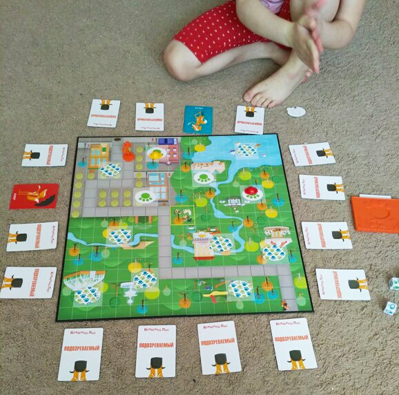 Бросать кубики дети любят, а тут аж 3 раза можно!! И так постепенно вы собираете улики, передвигаетесь по полю, открываете закрытые карты с подозреваемыми. Размышляете,подходит ли этот или другой лис под наше описание.