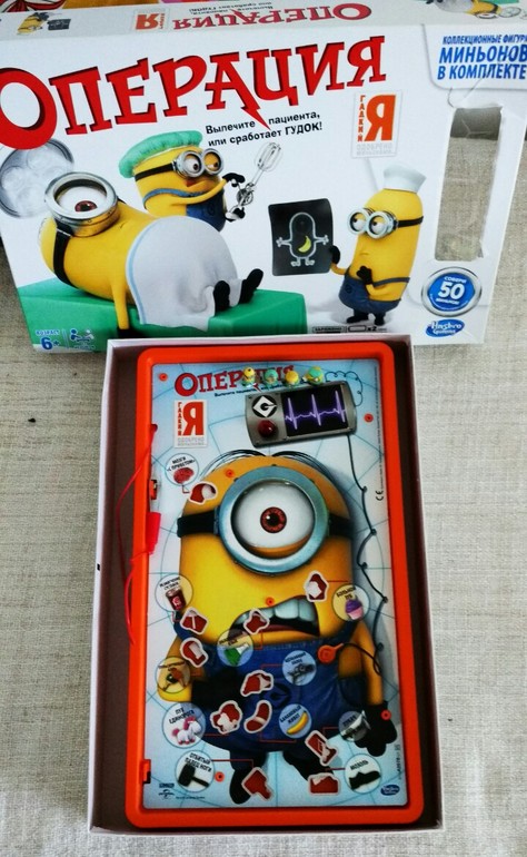 1) Операция Гадкий Я от HASBRO. Эту игру старший сын очень долго просил, год ждал, и хотел именно с миньонами. По отзывам я слышала, что игра "на раз". В августе мужу перепал сертификат на 5 тыр в Детский мир, решили купить. Так и получилось - за почти за полгода играли раза 3 - 4.
