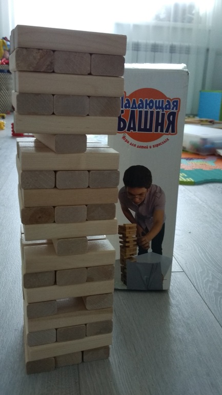 10) Падающая башня (Дженга). У нас самая простая, купленная в Ашане. Купили, когда сыну было чуть более 4-х лет. Сначала не очень аккуратно у него получалось вытаскивать бруски, потом лучше. К 5-ти годам, можно сказать, играет на равных. Младший тоже с удовольствием играет в силу своих способностей и возраста) Федя также из брусков строит свои "города" и "башни")