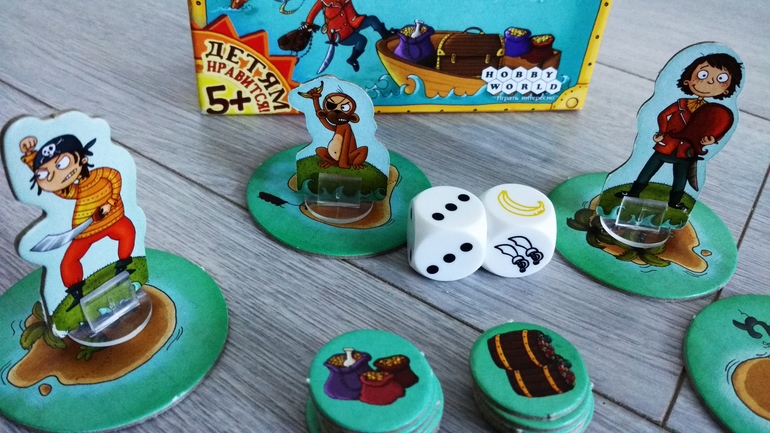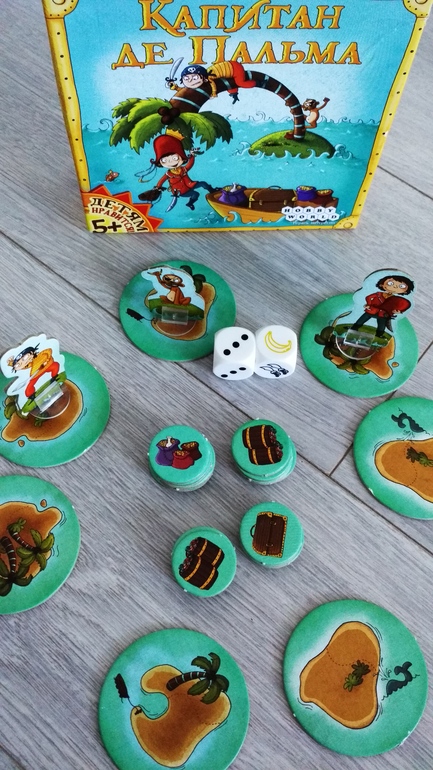 8) еще одна наша игра от Hobby world Капитан де Пальма. Даже не знаю, что про нее сказать...Вообще не "зацепила" сына. Мне кажется мы в нее даже один-единственный раз не доиграли. Я повелась на пиратскую тему) игра - Острова, три фигурки - пират, попугай и капитан Де Пальма,- жетончики с сокровищами и 2 кубика. Сначала ходят пират или обезьянка, согласно выпавшему кубику, затем делает ход капитан. Если капитан попадает на остров, где стоит обезьянка или пират, то отдает ( пирату или обезьяне) неспрятанные сокровища (круглые жетончиков-сокровищ). Если нет, то получает жетончик с сокровищами. Можно решать - ходить дальше или передать ход другому игроку и припрятать сокровища. Выигрывает тот, у кого больше жетончиков-сокровищ. Игра сделана качественно, плотный картон.