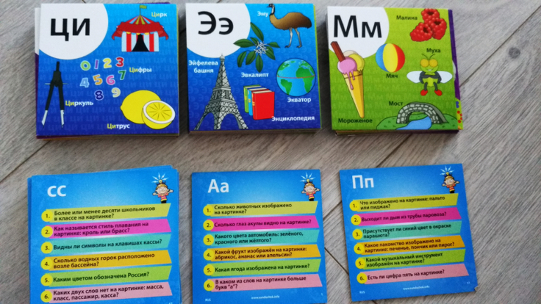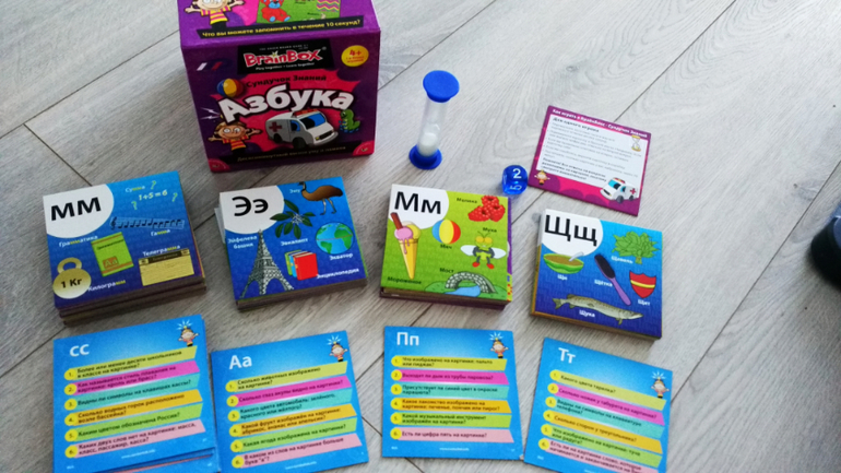 9) далее коробочка Азбука Brainbox. Нам подарили гости на 5 лет. До этого я ничего не слышала о сундучках brainbox. Качество отличное - толстый картон. Играем как мемори. Сын смотрит на карточку и запоминает предметы, пока песок сыпется в часах. Затем переворачивает на обратную сторону, кидает кубик и отвечает на вопрос под выпавшим номером. Вопросы написаны на обратной стороне карточки. В нашем сундучках есть буквы (33 шт) и есть большая стопка карточек на правописание ( жи-ши, ча-ща, б-п и др) . Мы играем только с буквами. Не могу сказать, что играем часто, но если играем, то за раз карточек 10 можем позапоминать)