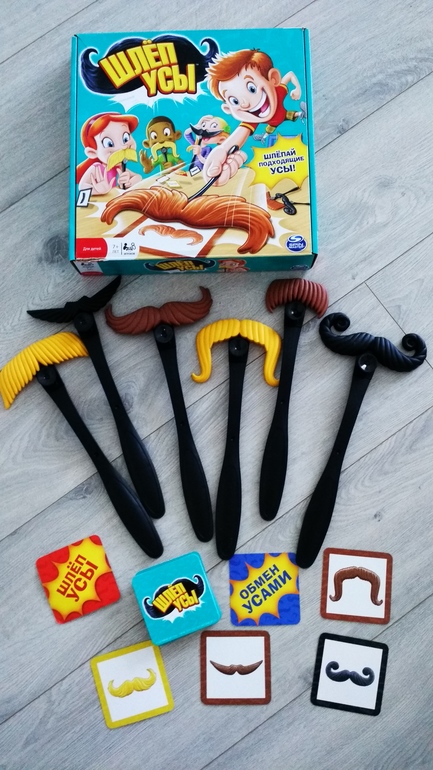 4) Шлеп усы . Тоже сын просил полгода, бабушка ему подарила на 5 лет. Игра на реакцию, внимательность, ловкость - кто быстрее шлепнет карточку с усами , подходящую по форме и/или цвету. Игра очень нравится, азартная. Младший Федя тоже быстро понял , как играть, играем втроем. Единственное, у нас усы, присоска, быстро пачкается и плохо цепляет карточки. Я помыла в воде с мылом, стало лучше, но все равно не как новые. Может кто-то сталкивался с такой проблемой, что делали)