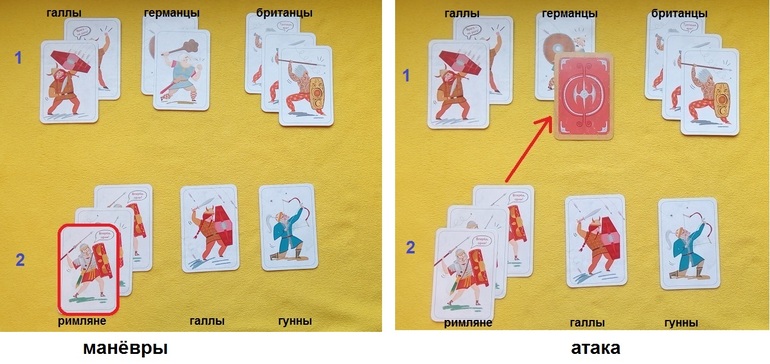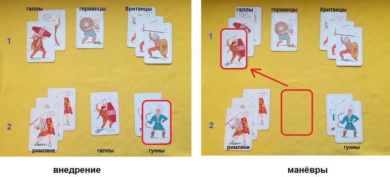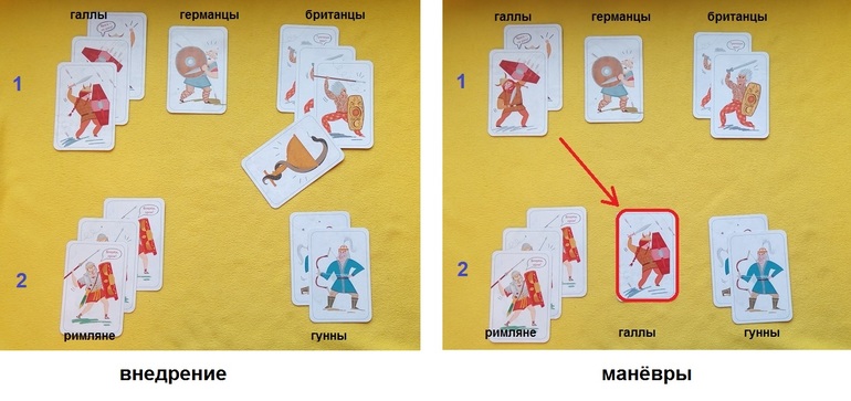 Игрок №2 не может атаковать галлами и гуннами. Их всего по одной карте. Атаковать может только римлянами и не британцев (тех столько же сколько и римлян). Остается напасть на галлов или германцев. На галлов нельзя, их в свой ход игрок внедрял. Значит нападаем на германцев и в ходе нашей атаки одна карта германцев уходит в отбой (на фото перевернула карту).