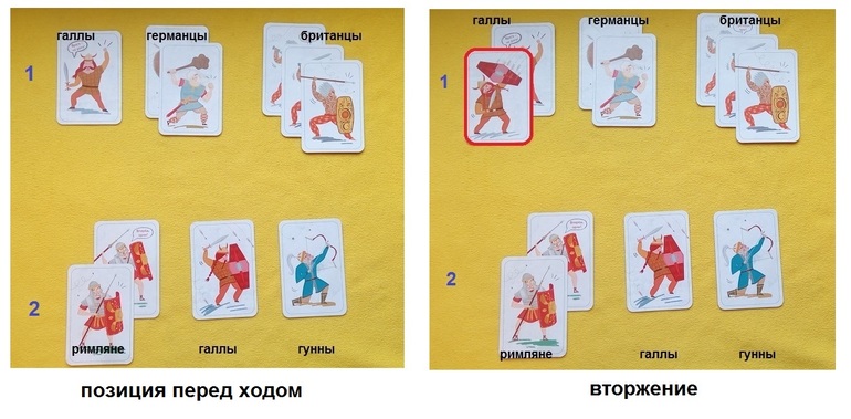 Первое действие - вторжение. Игрок должен скинуть любую карту с руки на территорию противника. Игрок скидывает галла. Т.о. у противника увеличивается войско галлов до двух.
