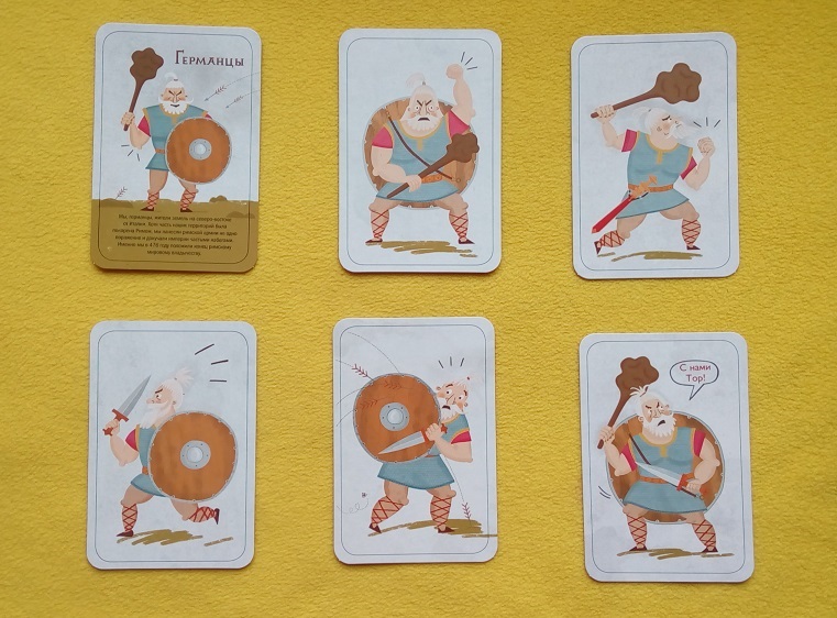 В игре 55 карт с изображением пяти народов. Еще пять с названием и описанием народов и пять карт болезней. Вот так выглядят германцы.