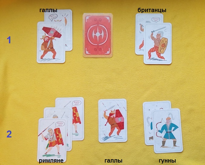 Игрок №2 завершил свой ход. Добирает две карты с колоды. В ходе своих действий игрок №2 увеличил войско, за которое они играет (галлы) до трех особей (считаются все карты, что находятся на столе) и убрал одного германца (у игрока есть подозрения, что его противник собирает германцев).
