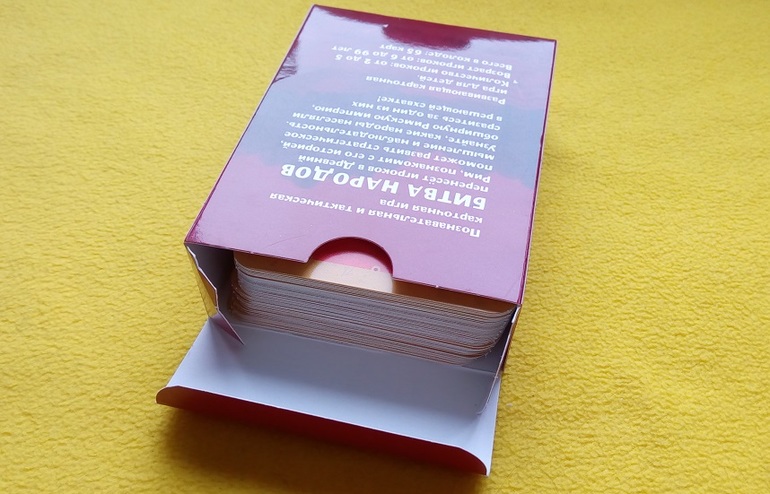 P.P.S. Совсем забыла написать. Коробка игры без "воздуха", только карты. Размер коробки 8х11х3 см. Карты чуть меньше, т.е не маленькие.