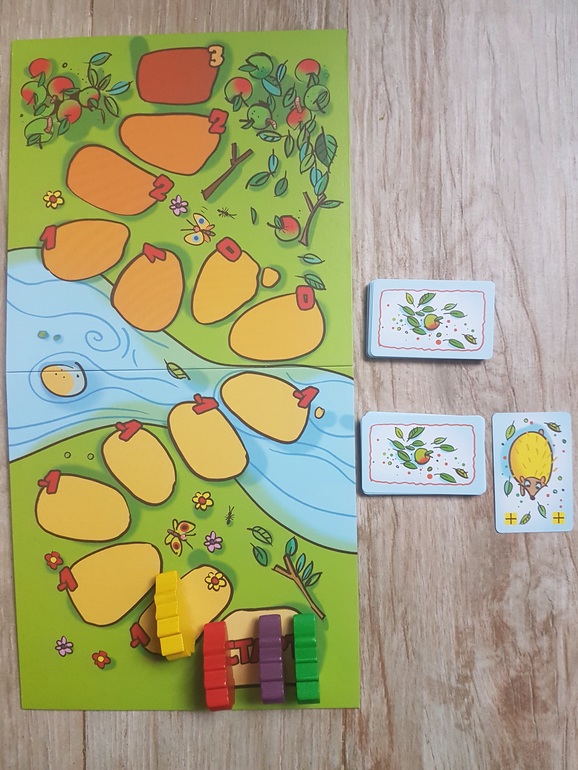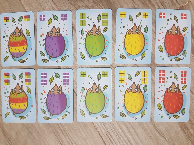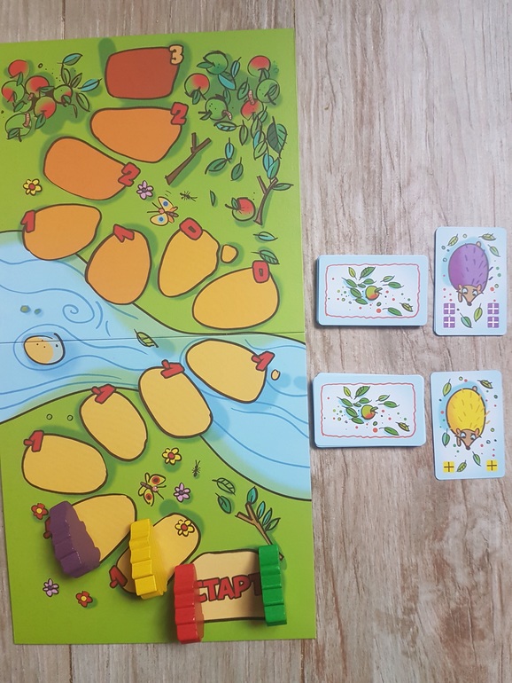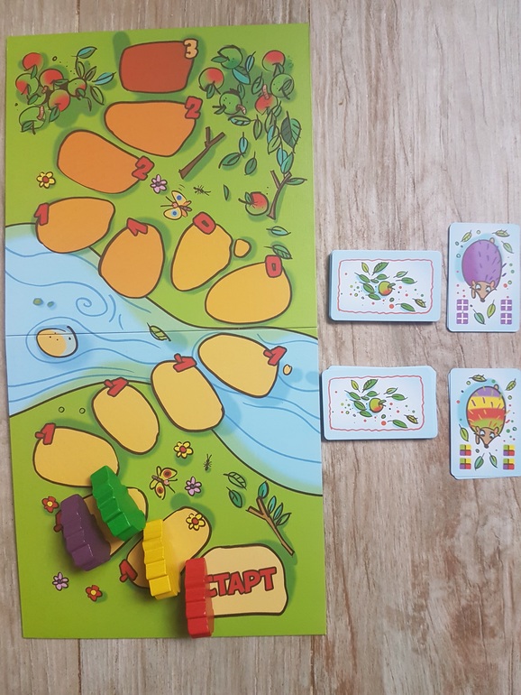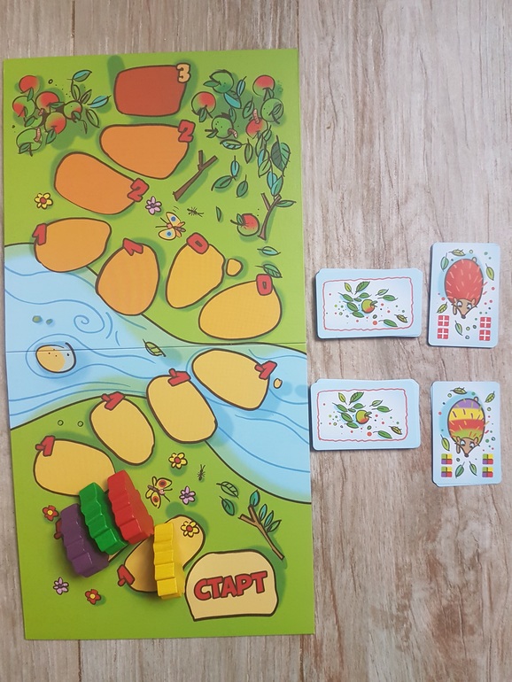 На старт ставим сразу всех четырех ежей, карты делим между участниками, поскольку мы играем с сыном вдвоем, делим поровну по 15 или 20 карт (всего их 55). Карты вот такие: