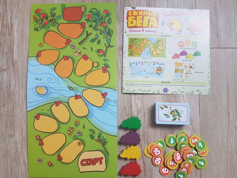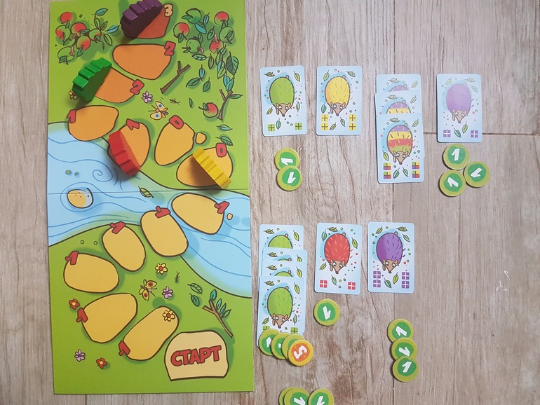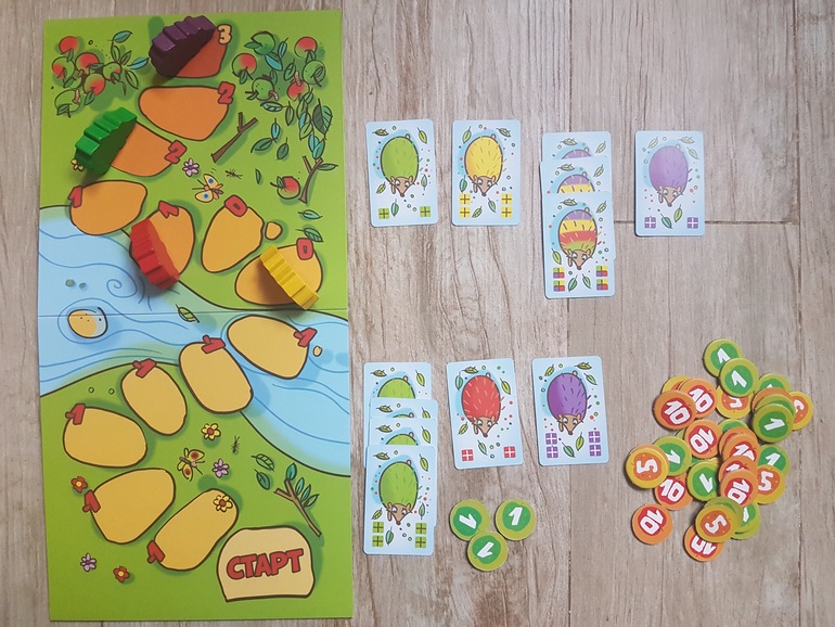 Игровое поле, 4 фигурки ежей четырех цветов, карты, жетоны - победные очки, правила игры.