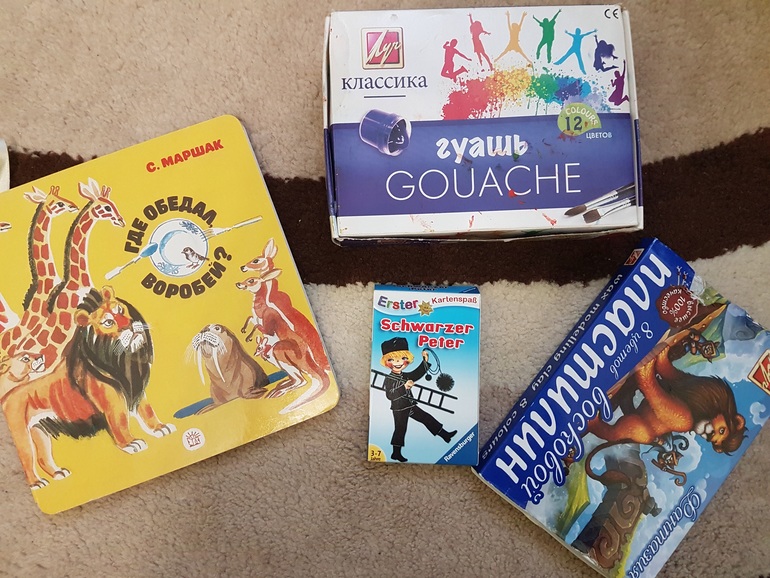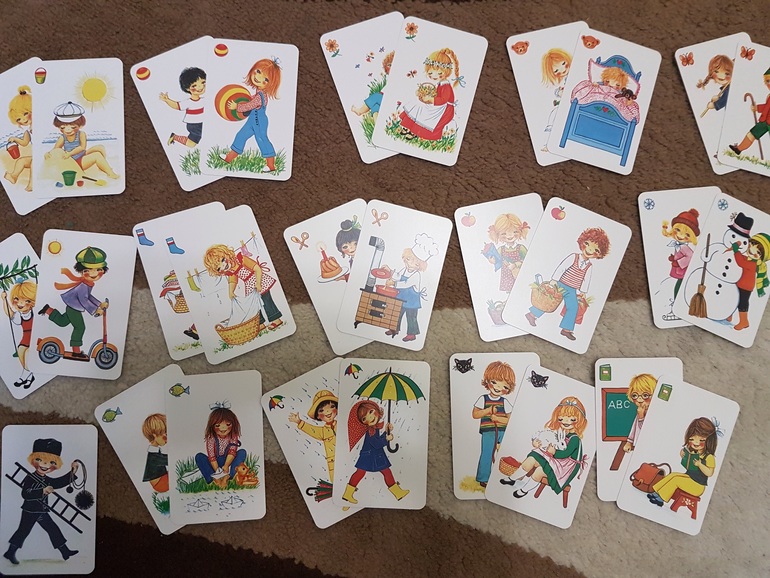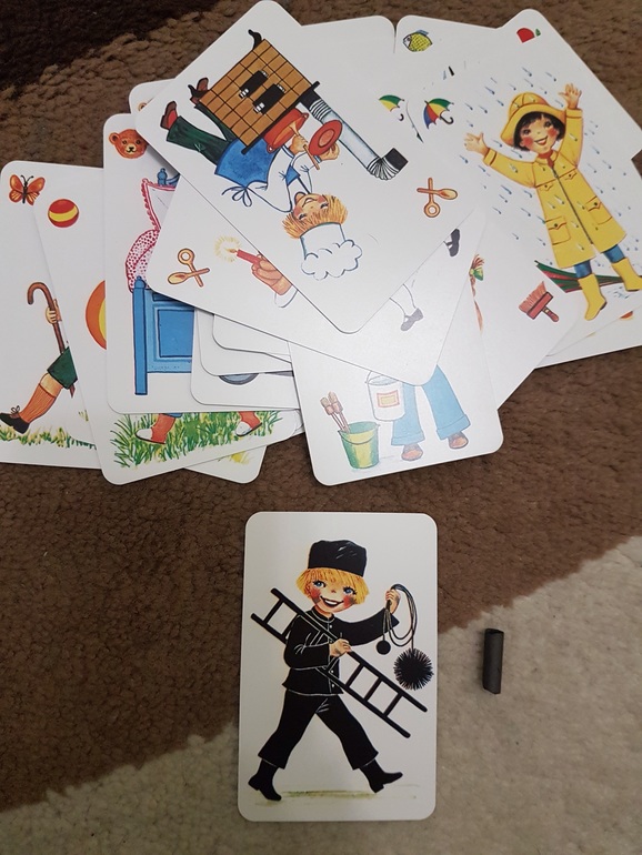 В коробочке: 31 карта (15 парных карт по рисунку в верхнем левом углу и 1 карта с изображением трубочиста Питера), правила игры и черный уголек:)
