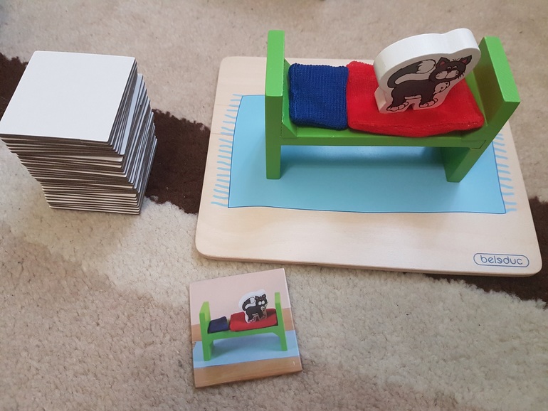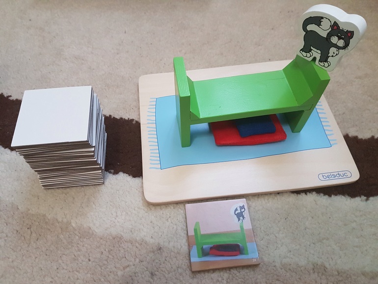 А вот здесь мне ребенок не засчитал правильный ответ, поскольку котенок на кровати повернут передней частью ближе к нам, а на карточке с заданием котенок повернут задней частью.