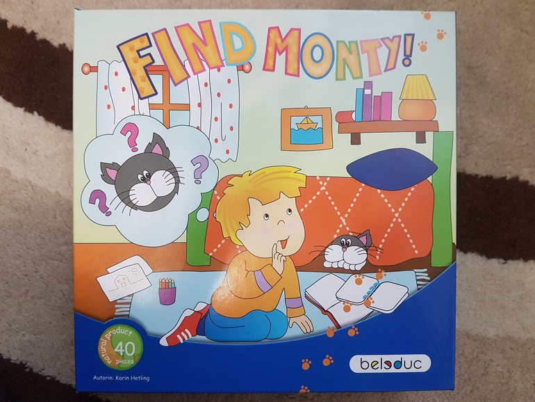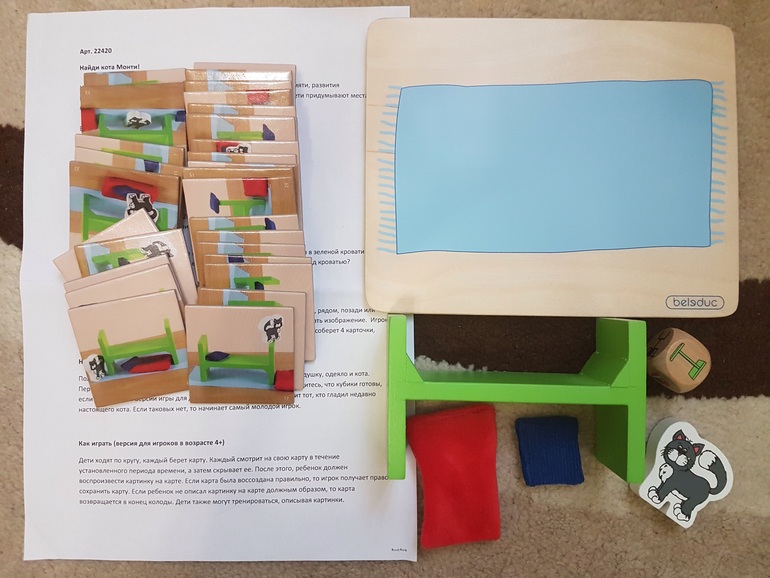 В коробке: доска с ковриком (дерево), кроватка, одеяло, подушка, фигурка котенка, кубик (для усложненного варианта игры), 34 карточки и правила.