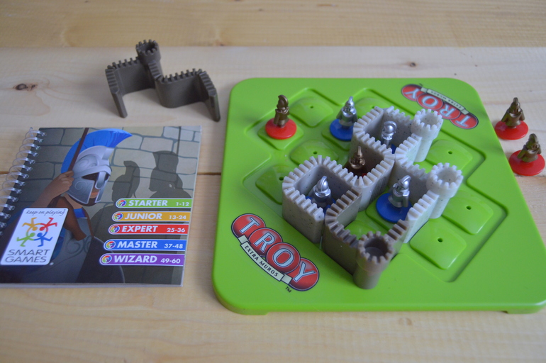 Суть игры: расположить врагов (красных рыцарей) и защитников (синие рыцари) так, как показано на карточке-задании. Синие рыцари обязательно должны быть окружены стенами, а красные воины вне их. Всего 60 заданий, пяти уровней сложности. Уровень starter сын прошел быстро, а вот над остальными заданиями "ломает" голову и мама))