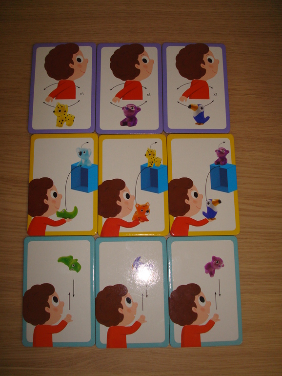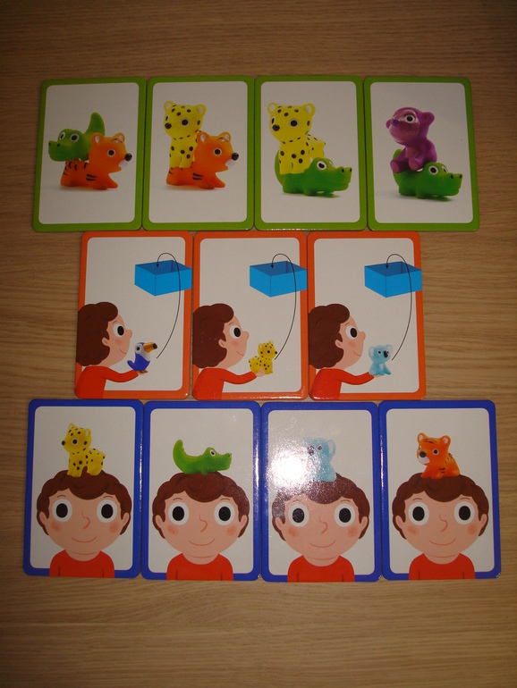 Задание № 1: пирамида. Игрок берёт 2 животных, изображённых на карточке, и старается поставить их одно на другое, как показано на карточке. Результат засчитывается, если пирамида простояла не менее 30 секунд.