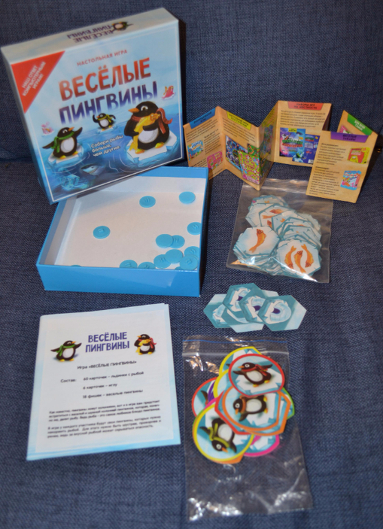 Аналог игры "Эй!Это моя рыба!". Сама задумка игры интересная, однако играем редко (когда сын сильно просит), т. к. вся игра превращается в бесконечное поправляние "льдинок". Не знаю, есть ли эта проблема у оригинала...А ещё убираем акулу, дабы игра не заканчивалась, не успев начаться.Коробка довольно плотная.Из минусов - фигурки пингвинов не держатся в подставках.В наборе лежит рекламка игр лас-играс))) Прям как в дорогих играх