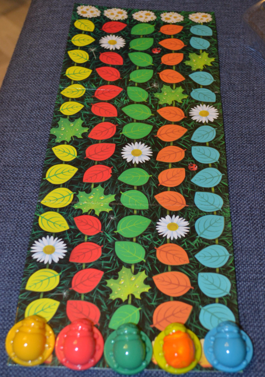 Аналог "Гонок ёжиков". Играли папа с сыном и как-то не оценили. Цвета у жуков перепутаны - в инструкции и на карточках фигурирует оранжевый жук, а по факту имеется светло-зелёный. Пришлось перекрашивать))) На кубиках красный и оранжевый цвета очень похожи, приходится приглядываться. Тоже подкрасили))) Сами кубики потрескавшиеся.У "Гонок ёжиков" инструкция (судя по видеообзору) более подробная, рассмотрены все варианты, тут же только основные правила, разобраться сложно.Коробка довольно плотная.Поле пыталась выгнуть, чтобы лежало ровно, в итоге чуть не порвала...Итог - качество на 3.