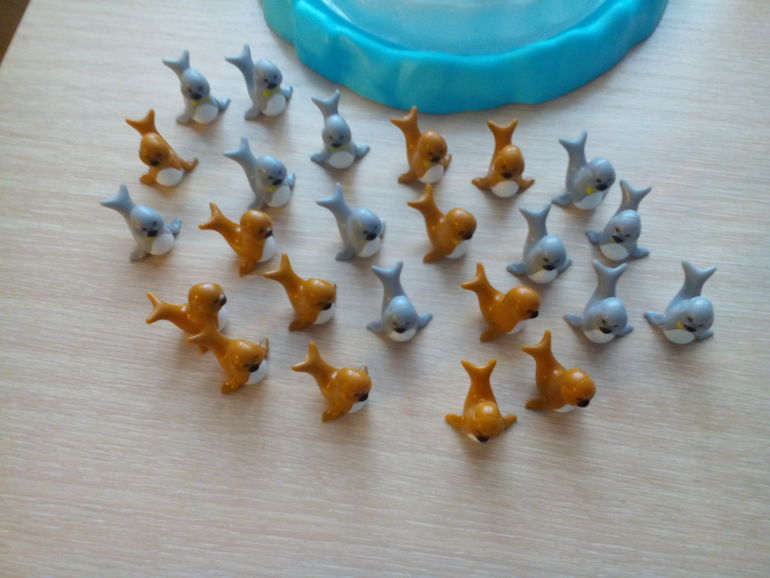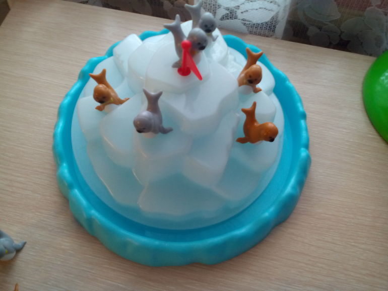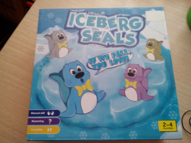 Возраст 3+.Можно играть вчетвером, что для нас очень актуально. Всего тюленей 24 шт. Перед началом игры они распределяются между игроками. Цель игры - переместить как можно больше своих тюленей на айсберг, у кого они закончились, тот и побеждает. За один ход можно поместить только одного. Если тюлень падает, вы должны забрать его себе обратно, а заодно и тех, которые упали в ваш ход вместе с ним. На самом деле, посадить своего тюленя не так то просто, особенно если на айсберге уже сидят несколько, айсберг скользкий, покачивается. Конечно нашему младшему задача трудная, но он не расстраивается, с удовольствием сгребает себе всех упавших. Пока наш рекорд одновременно на айсберге штук 8 от силы, будем совершенствоваться.