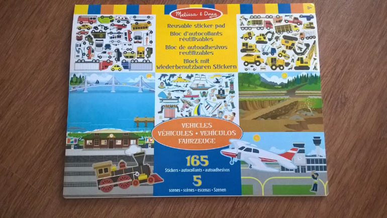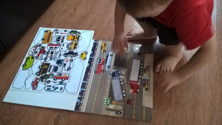 Оооооочень подолгу может занять сына наклеиванием)))Причем это не обычные наклейки, а какието намагниченые чтоли клееночки, не рвущаеся, прослужат долго. Для фанатов машинок просто находка, в принципе есть много и других тематик этих наклеек.