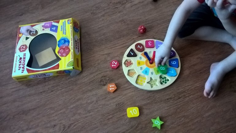 Многофункциональная чудо вещь))) Пока время мы конечно не изучаем, но цвет,цифры, счет, формы это прям в точку, очень нравится.В комплекте 2 кубика с часами и минутами, кидаю один кубик и ищем циферку и ставим нужную фигуру. Качество отличное,туговаты стрелочки, но не критично.