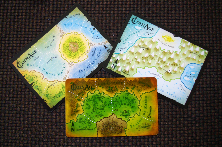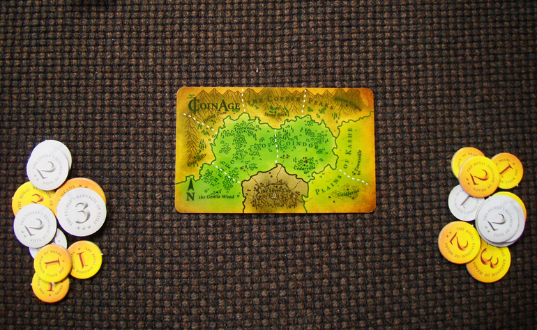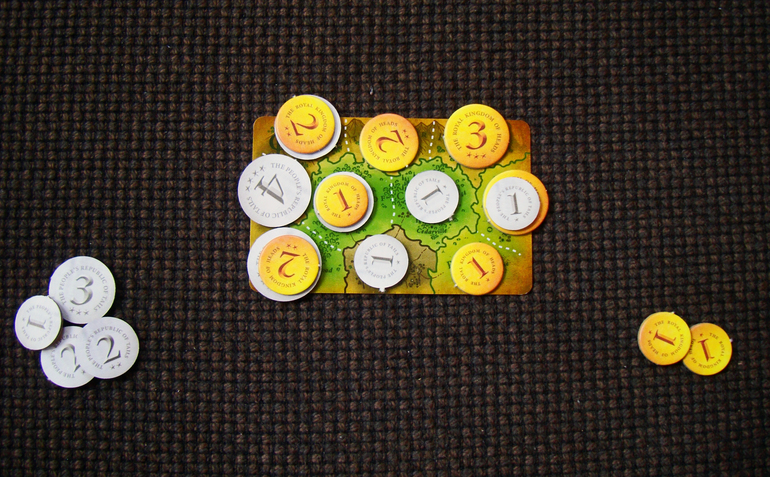Захват территорий происходит с помощью монет: у каждого игрока должно быть 10 монет разного номинала. Монеты можно взять из собственного кошелька и ориентироваться по орлу и решке. Можно свои же монетки покрыть наклейками из комплекта игры. А можно играть картонными, которые вы найдете в конверте.