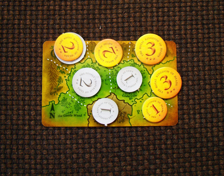 Процесс. В свой ход игрок берет четыре монетки разного номинала из запаса. Подбрасывает и смотрит на выпавший результат. В зависимости от того, сколько монет упали нужной стороной, игрок может предпринимать разные действия: вкладывать монеты на карту, передвигать их или даже убирать с поля. Все это с целью захватить как можно больше участков на карте: