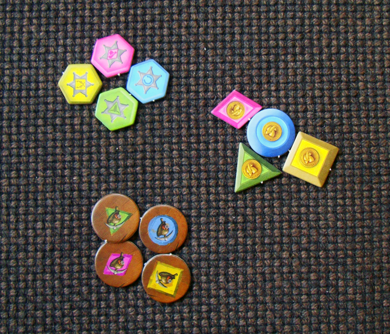 Подсчет довольно интересный. Игрок, у которого больше всего собственных эмблем на поле получает столько очков, сколько эмблем на поле у второго по успешности игрока. У второго очков столько, сколько эмблем выложено у третьего и так далее. Игрок с самым маленьким количеством эмблем очков не получает.