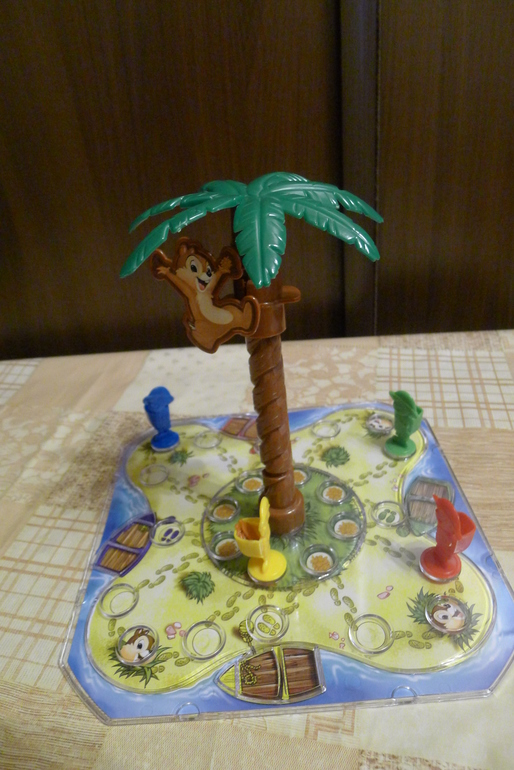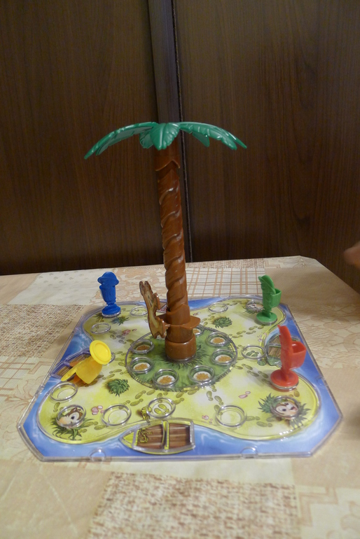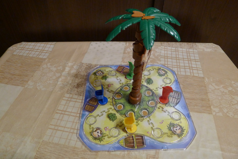 Итак, кидаем кубик и идем по нарисованным следам, которые то подходят к пальме, то удаляются от нее. Вокруг пальмы нарисованы орехи. Как здесь останавливаемся, берем орех. Если остановился на ячейке с бурундуком, то можем помешать другим участникам собирать орехи. Для этого нажимаем на верхушку пальмы и с нее по спирали скатывается недовольный бурундук. При этом он сбивает с ног кого-нибудь, и орехи рассыпаются. Человечка поднимаем на ноги, а орехи возвращаем на пальму. Если в рюкзачке было 4 ореха, то один оставляем человечку.