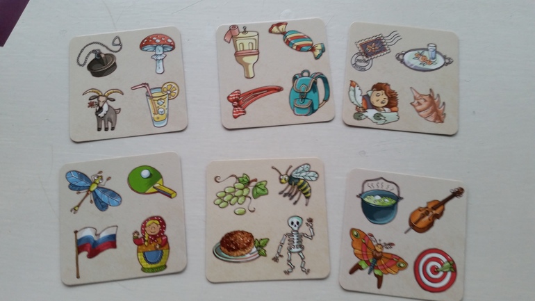 Суть игра в том, на стол одновременно выкладываются 6 карточек с картинками и все игроки пытаются найти рифмы на картинках. кто первый нашел, забирает карточки себе. Выигрывает тот, кто к концу игры соберет наибольшее количество.