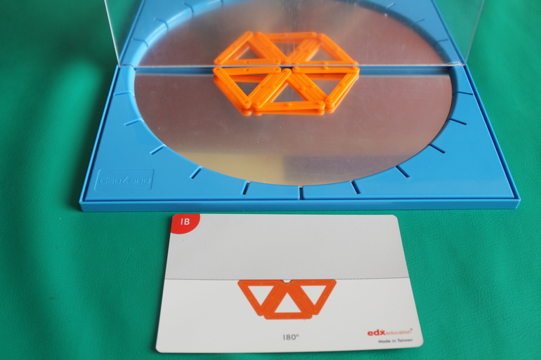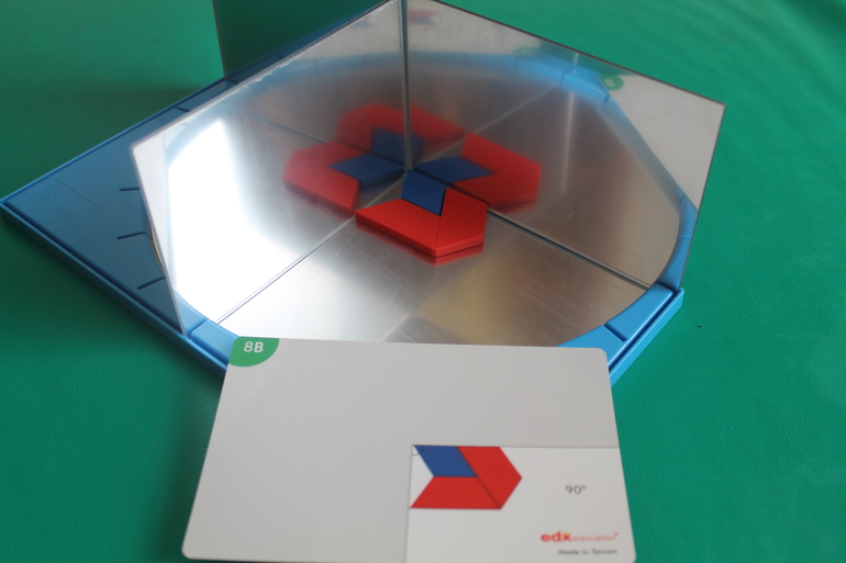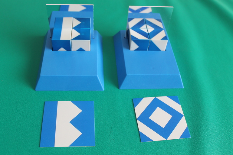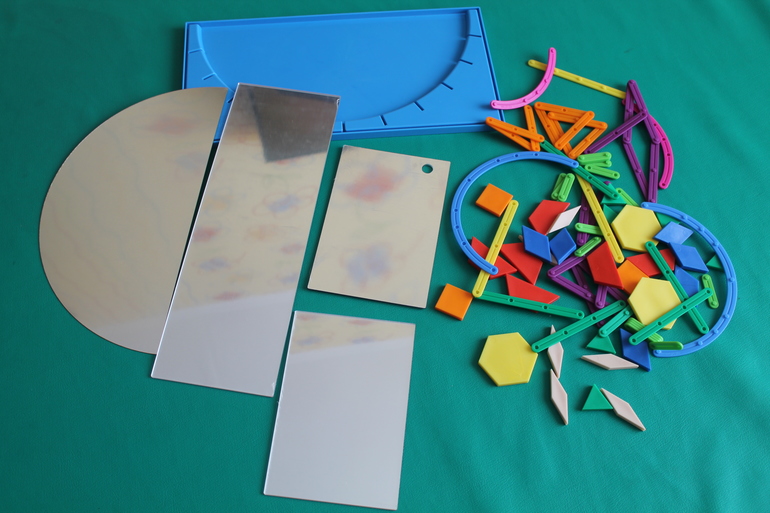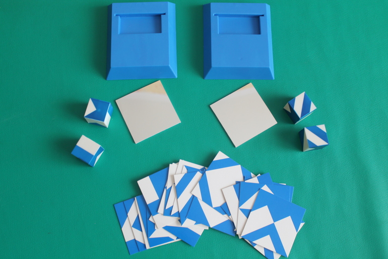 В набор входит: 2 подставки, 4 кубика, 2 зеркала, карточки - задания.
